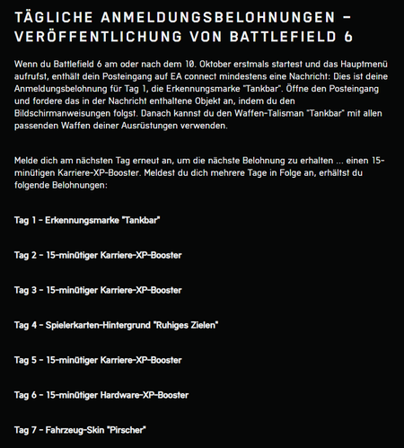 kANNNNTERising Observer2 months agoTägliche Belohnungen funktionieren nicht Ich bin heute erst darüber aufmerksam geworden, dass es ja scheinbar tägliche Belohnungen gibt. Laut einem offiziellen News Beitrag, wie im Anhang zu sehen. https://www.ea.com/de/games/battlefield...Show More