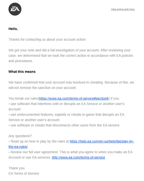 well I guess I'm just not going to play this game anymore, thanks EA. good luck everyone I hope u will get unbanned.