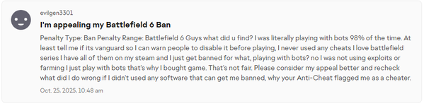 I have vanguard Anti-Cheat in background too cuz of league of legends, And most important and sad is that i cant appeal my ban cuz this darn button is not working please can someone help me im in bad situation rn i cant buy bf6 again for 70 bucks i just want to have fun in bots and chill after hard day cmon... please.