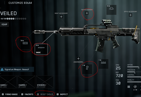 The Veiled weapon package is supposed to come with: A double-port break A 391mm CQB Barrel (Short) A 30RND Fast Mag And a 50MW Blue Laser As of 1.1.2.0 these attachments are no longer defaul...
