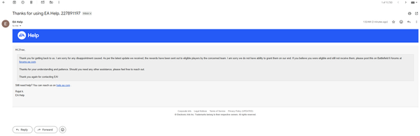 literally was told by ea support to post on here if i believed i am supposed to have the rewards for not being able to play at release. if i could get my rewards that'd be sick instead of feeding money to a company that doesn't need it.