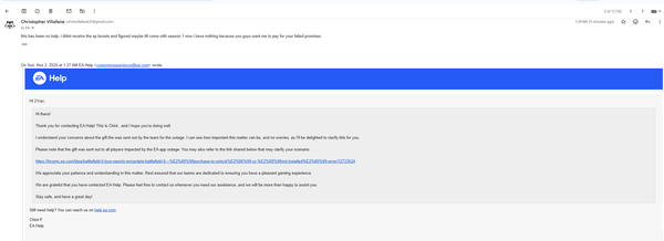 I just spoke to another support agent who told me they’re still evaluating the issue. Seriously?! If I don’t receive the promised compensation, I swear I’ll never spend another cent on an EA game again.