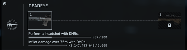 Also with the damage being -2,147,483,520... whenever I actually get damage over 75m to bring this down it resets to this exact number after every match making it impossible for me to ever achieve. I cannot do 2.1 billion damage with DMRs within a single round of anything. This needs to be fixed as there are 2 guns I am forever locked out of because of this.