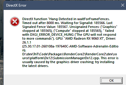 - Exception code: 0x887a0006 = DXGI_ERROR_DEVICE_HUNG