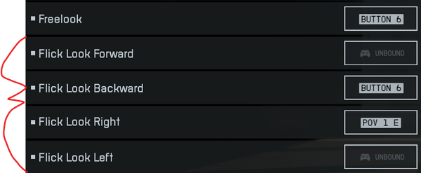 Instead, pilots have to press Freelook AND Flick Look. Flick Look should be accomplished with a single button press. As is, pilots are having to choose which single Flick Look to simultaneously map to Freelook.
