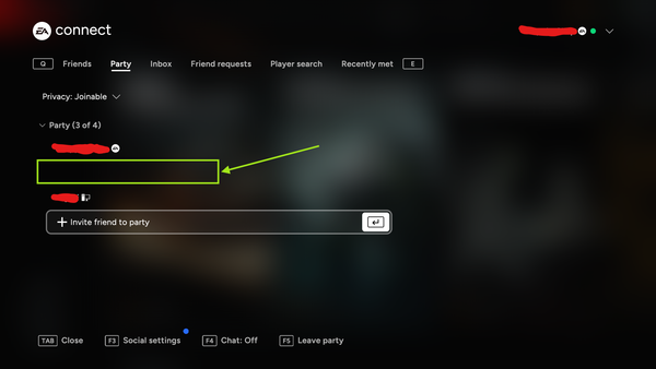This started happening after the end of an overzealous ban of a week (but this is another topic). Once my ban was over, I came online to play and none of my friends could see me as "playing bf6" (it seems im always just "in menu" or something) and thus cannot join me to form a party (my invites don't seem to work either). The only way that I can play is if I'm always the one joining on them or sometimes it works if I reboot my game (but this needs to be done pretty much every single time). They then see me as a "ghost" as can be seen in the screenshot bellow (perspective of my friend). My name should be where the green box is. Can someone look into this please. Thank you.