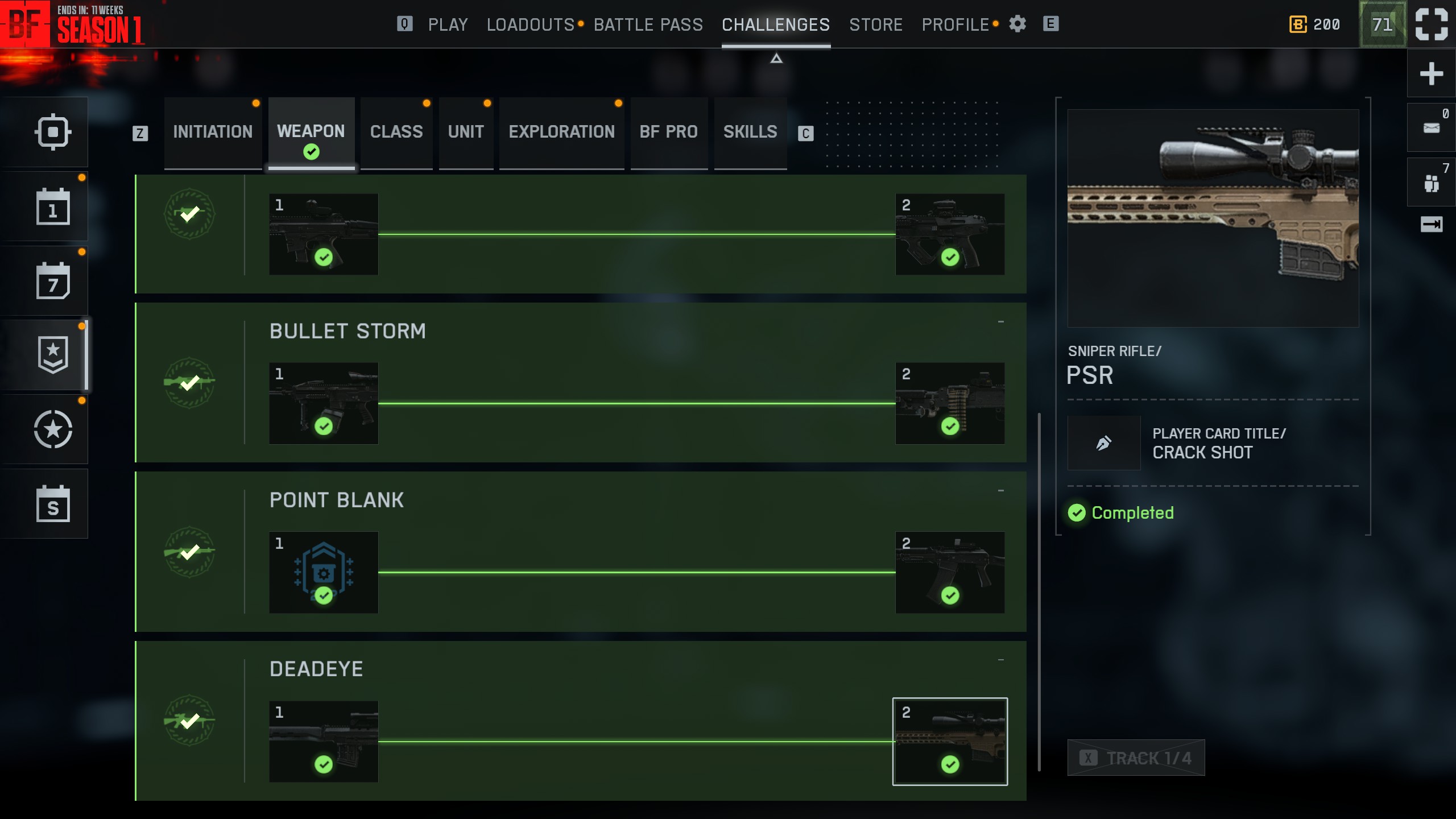 Patch last week lowered requirements for several challenges, including Deadeye 2. Before the update I was at 115/150 200+ meter headshots, and 300/300 sniper kills. Not sure how much progress I had on Danger Close 1 but the QBZ-192 also says unlocked but can't be used on any classes. Issue has been going on for about a week, with a reinstall, multiple restarts, and multiple games played between now and then.