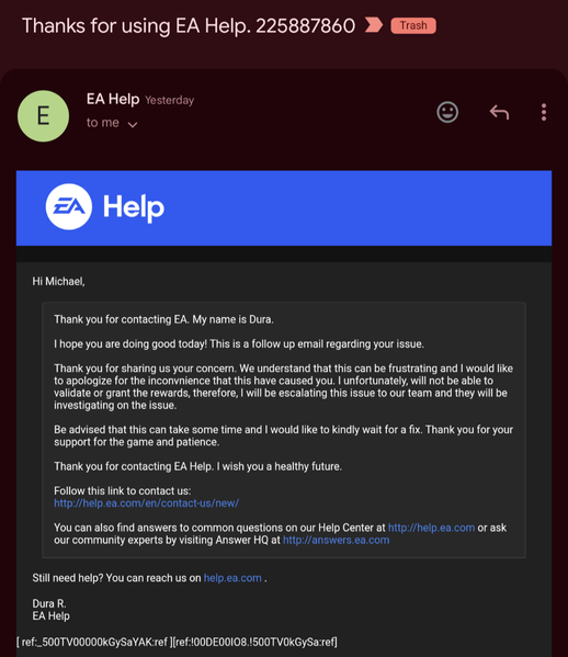 • I only got Day 1 and Day 5. I missed Day 4 legit, but I should have gotten the rest and did not. Never got the message in my Inbox. I opened a case in EA help and they are absolutely useless. They just keep giving me procedural instructions that I already know or thought I was talking about the EA App outage rewards.