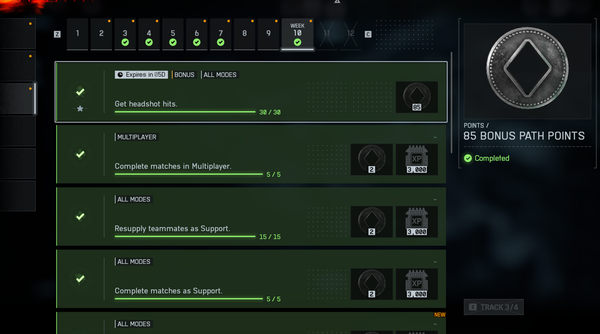 I too, have this problem. Slightly different, however. My problem is that while it shows I earned 85 bonus path points, it didn't apply it to the BF Pro path at all. Leaving me stuck with the first 3 tiers.