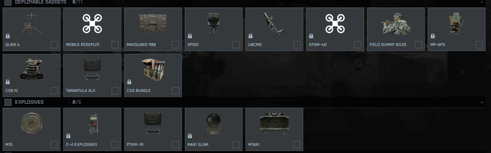 - Tarantula ALX (Assault Ladder) under "Deployable Gadgets" - Enabling/Disabling this ONLY enables/disables the Recon Decoy (Field Dummy No.25). It has no impact on the assault ladder