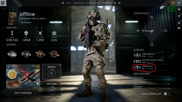 Playing on PC, v1.0.1.0 (Steam). On my profile, the Career Best panel shows “Savior Kills — 53 / In a Match.” I’m pretty confident I’ve never been anywhere near 53 kills in a single match, but I have had matches with a lot of revives. It looks like this label might be incorrect and actually referring to “Revives in a Match.”