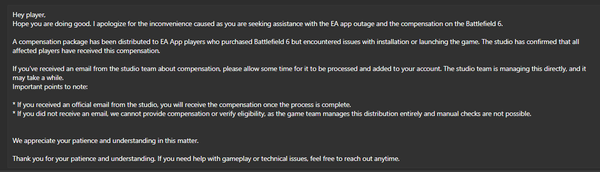 We're aware that some players impacted by the EA app outage during the Battlefield 6 launch did not initially receive their in-game rewards. This issue was caused by an error in the rollout process. We've completed a review of the timing and activity in this window and distributed items to players who were initially missed.
