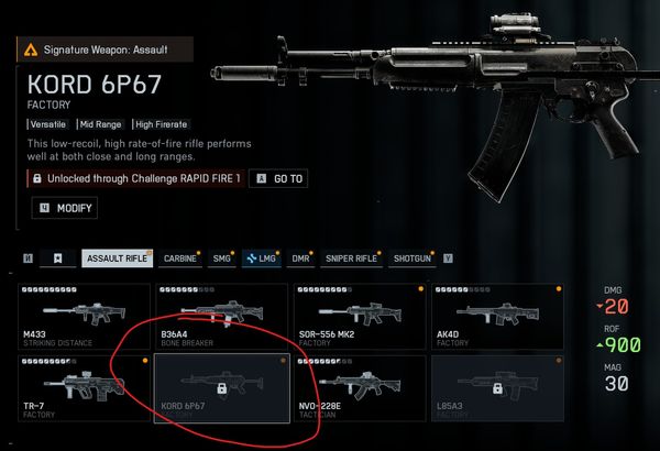 I started off as a free to play player. Downloaded REDSEC, progressed some challenges. For example, to unlock the KORD 6P67 I needed to inflict x damage with an Assault Rifle and get y kills with an Assault Rifle. As a f2p player, it was 300 kills. I had about 100 or so. I then bought the full game, and those challenges dropped to 30 kills, so the challenge shows it as complete and it allows me to progress the next challenge to unlock the NVO-228E. Problem is, the KORD isn't actually unlocked and there's no way now to unlock it.