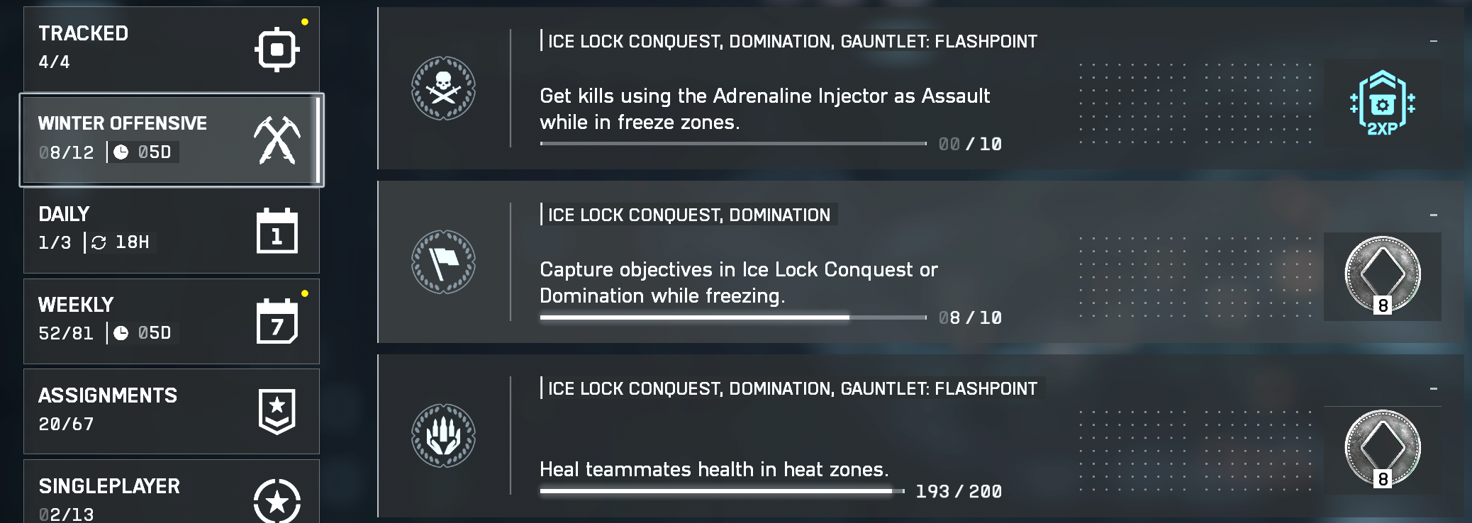 Also have a challenge to heal teammates near heatzones, it has 192/200 and it seldom registers from a match. And I do leave the support class Restock bag that heals, constantly throwing it at teammates near heat zones.