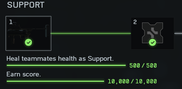 Вчера, при изменении требуемой активности для различных заданий, автоматически выполнилось первое задание класса "поддержка", поскольку количество восполненных очков здоровья союзников было ~700-800 единиц. При этом, точно не уверен, другие задания на оружия таким же способом выполнились без данной ошибки.