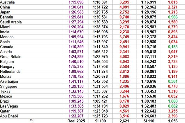 I'm including a table with the actual qualifying times for F1 2025 and F2 2024. The SI 100 times are shown next to them, as they are theoretically expected to be close to the actual times. It's clear that there are significant performance gaps at various tracks (Belgium, Qatar, Great Britain, China...).