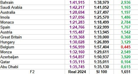 I'm including a table with the actual qualifying times for F1 2025 and F2 2024. The SI 100 times are shown next to them, as they are theoretically expected to be close to the actual times. It's clear that there are significant performance gaps at various tracks (Belgium, Qatar, Great Britain, China...).