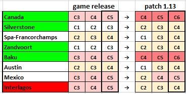 This got me thinking, I went to check the compounds expected for each track that I saved at the game release and I found the differences below, which I don't know if they are specifically related to patch 1.13 or modified from time to time (from further investigations the Silverstone case may be there starting from patch 1.11, the others from 1.13) but the point is, each time you change (I guess) the soft compound for the track you change the performance in Time Trial too!!!