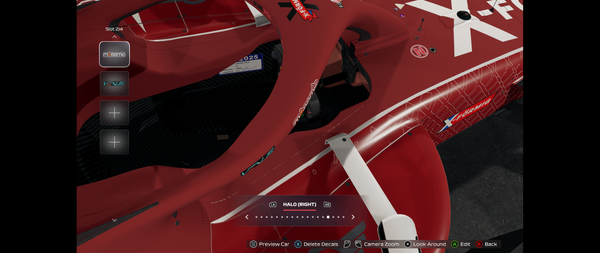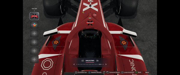 The location and the look of the white line are shown in the pictures below. I used the Decal Edit view for screenshots to better show the issue, but that white line appears in both Career mode and F1 World Car. It also appears in both the monitor view and in VR mode (I noticed it via VR mode to begin with).