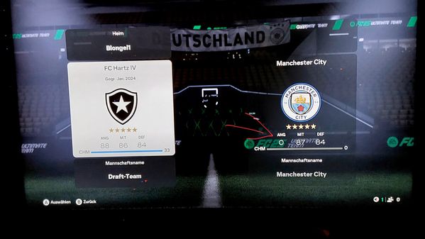 Diese laienhafte Amateuraufnahme zeigt den Startbildschirm vor dem 4., dem letzten Spiel, einer Einzeldraftsession auf Halbprofi.