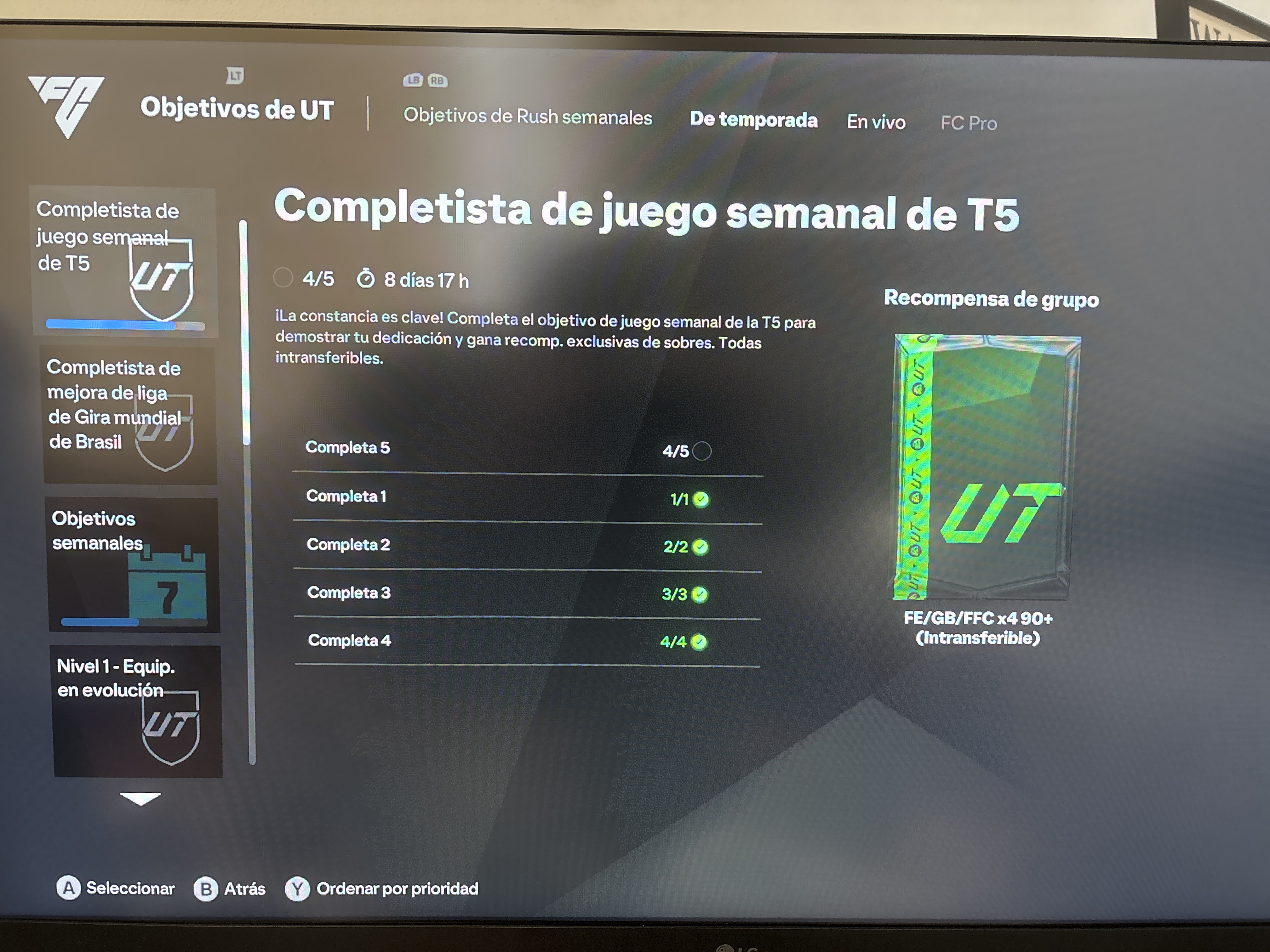 Resulta que en la 3 o 4 semana (no recuerdo fijo cual era), al completar los partidos y los requisitos que me pedían, me dio por completado el Juego Semanal correspondiente, pero no me lo añadió al objetivo de Completista de juego semanal de T5. Pensaba que era un error puntual y en algún momento me iba a contar esa semana, pero ayer completé la semana 5 y en el objetivo de la temporada me aparece que solo completé 4 semanas en lugar de las 5 que estoy segurísimo que completé, y por lo tanto me quedo sin la recompensa de x4 90+.