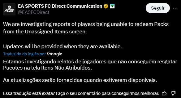 Loja está travada, não consigo resgatar os packs, sempre aparece uma mensagem: Ocorreu um problema na conexão com os servidores do Football Ultimate Team. Tente novamente mais tarde. E nunca resolve
