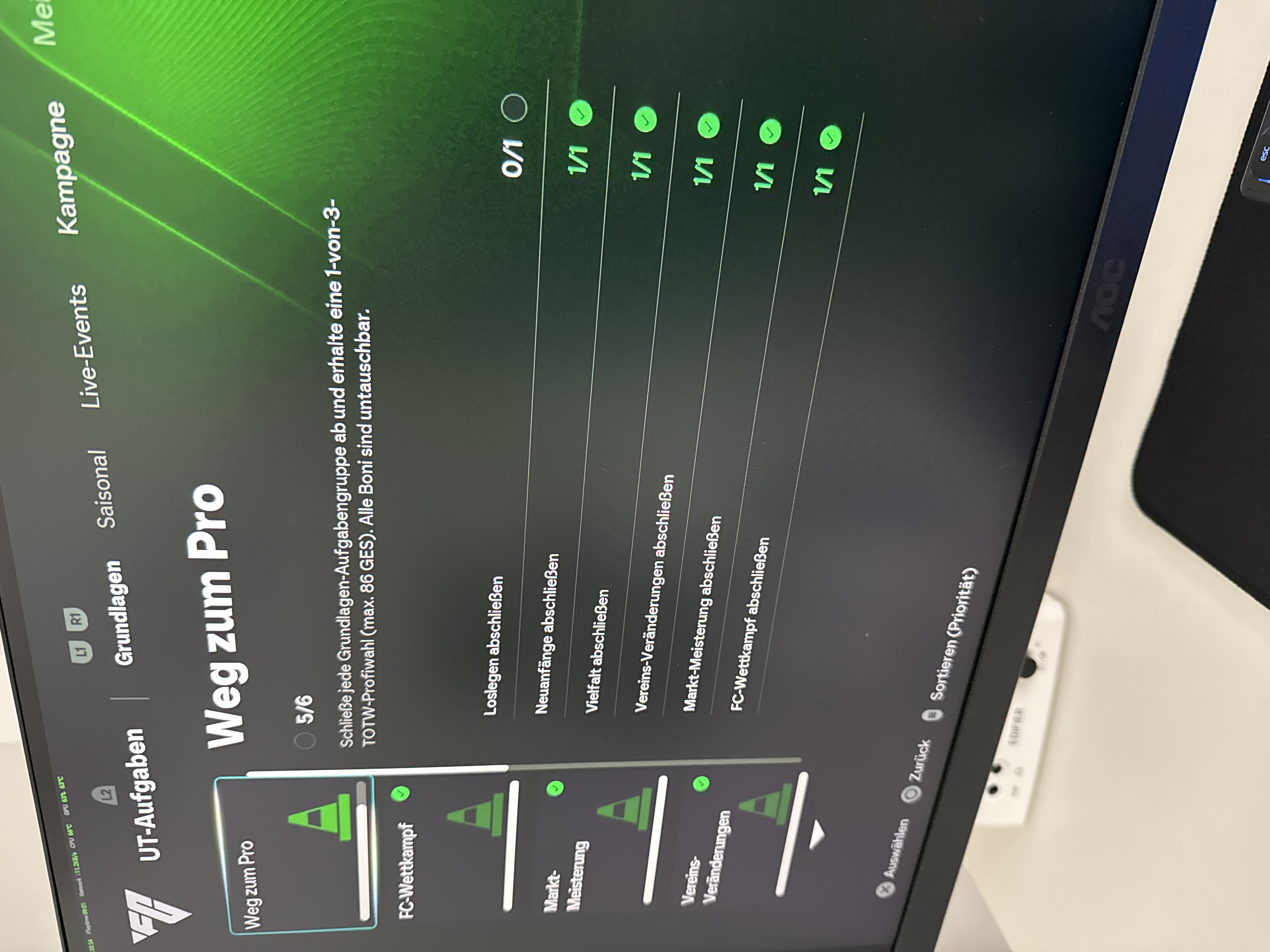 Die letzte Aufgabe beim „Weg zum Pro“ ist es die Aufgabengruppe „Loslegen“ abzuschließen, diese habe ich getan aber wird nicht abgehakt. Es ist besonders ärgerlich da morgen das neue Team of the Week erscheint und sich somit die Wahrscheinlichkeiten für den Playerpick verändern..