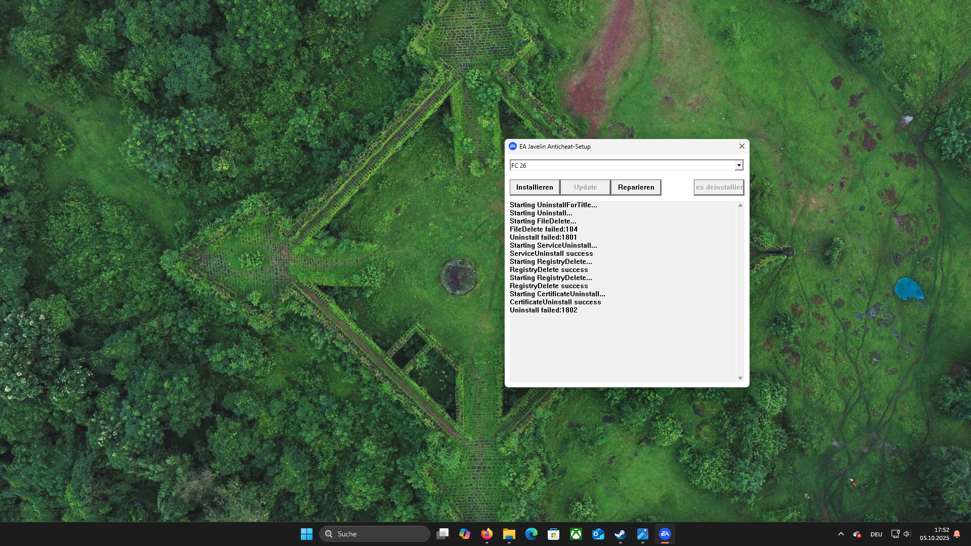 Moin ich bin echt verzweifelt ich habe mir einen steam Account mit fc 26 gekauft ich weiß nicht ob es daran liegt. Ich versuche das Spiel zu starten der anticheat launcher öffnet sich es dauert denn 1 min und denn steht da das ich anticheat öffnen soll oder das ich es neu installieren soll wenn ich das mache über javelin steht da immer ein Fehlercode 1113 und 701 Ich kann es also nicht neu installieren und auch nicht reparieren weil es immer das falsche Verzeichnis ist kann mir irgendjemand bitte helfen habe es gestern den ganzen Abend probiert und niergendwo habe ich den gleichen Fehler gefunden