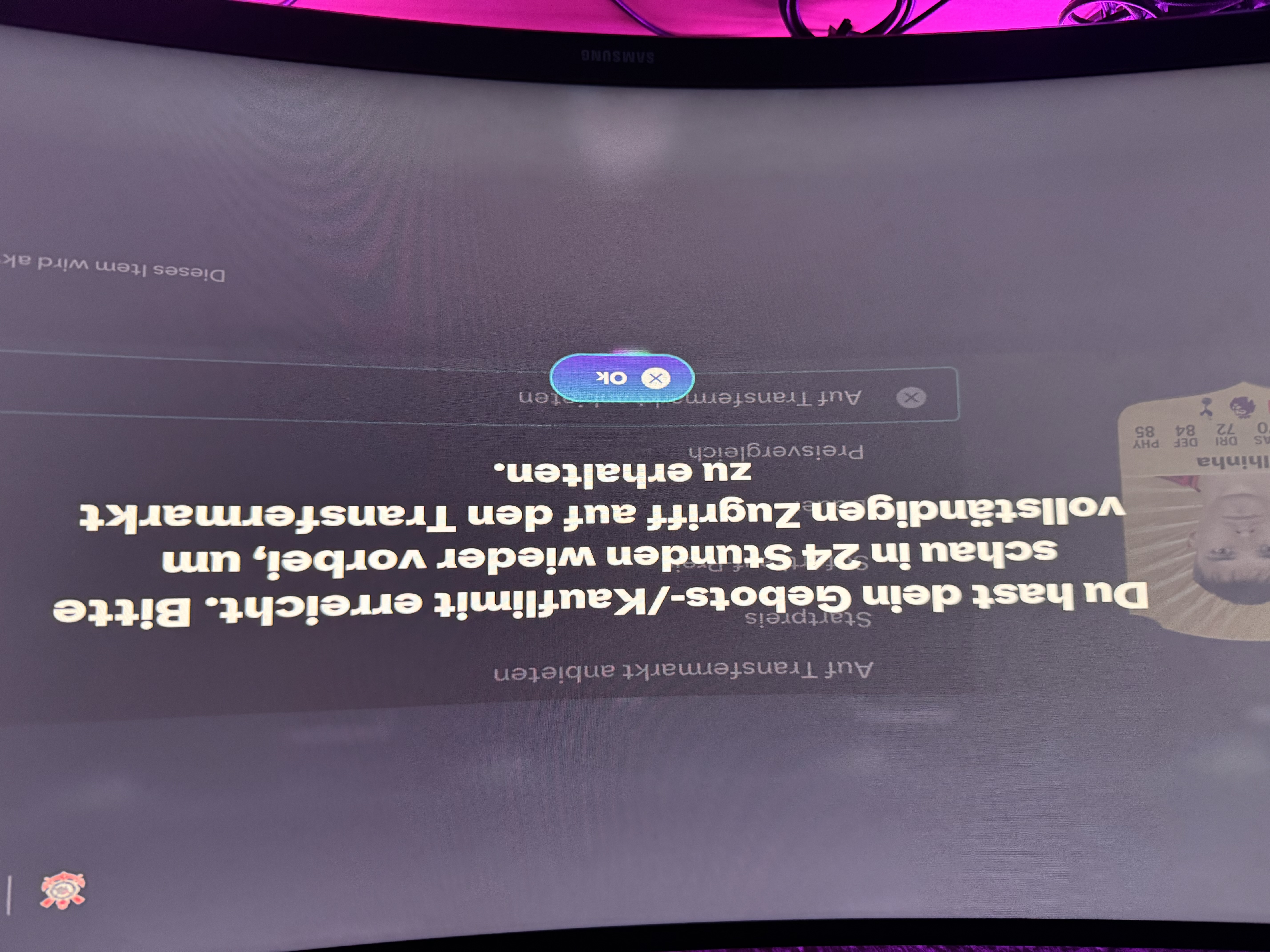 Ich habe keinen vollständigen Zugriff auf den Transfermarkt . Ich habe alle benötigten Grundlagen Aufgaben abgeschlossen die für den Zugriff des Transfermarkts sind. Trotzdem kann ich seit knapp 2 Monaten keine Spieler auf dem Transfermarkt verkaufen oder erbieten. Ich habe dieses Problem schon mehrmals gemeldet und bis jetzt wurde es immer noch nicht behoben. Diese Meldung wird mir angezeigt wenn ich Spieler anbieten will. Die 24 Stunden abwarten mit dem Kauf und gebotslimit hab ich ebenfalls schon mehrmals abgewartet.
