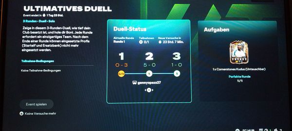 Ich habe im Modus Ultimatives Duell alle 3 Spiele am Stück gewonnen. Event- Status ist „Perfekt“ . Allerdings werden nur meine ersten beiden Spiele anerkannt.