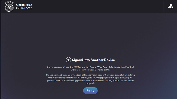 Nach diesem Vorfall habe ich versucht, das Spiel während eines Matches zu schließen. Seitdem kann ich mich nicht mehr bei Ultimate Team anmelden. Die FC 26 Webapp zeigt zudem an, dass jemand bereits eingeloggt ist, obwohl ich mich nicht mehr in meinem Account befinde.