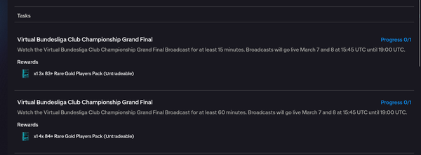 irondemig0dNew Spectator4 days agoWOW VBL Club Championship LA LIGA FC Pro CUPIch habe gestern mehr als 1 Stunde den Stream laufen gehabt auf meinem mit EA verbundenen Twitch Account. Aber kann leider die beiden Achievments nicht claimen!Danke im Voraus für Hilfestellungen!MFG