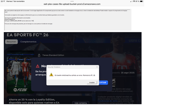 I cannot execute FC26 because i am getting an error with ea anticheat. I never was able to play. Is frustrating because i have not problems with the rest of platforms. I meet all requirements and everything is updated. Attached you have the screenshots with the error and the information extracted from Event Viewer. I tried it everything, so please, if i cannot play for any reason, would like to get a refund. Reinstalled anticheat, repaired the game. I executed as admin, but nothing, the result is the same