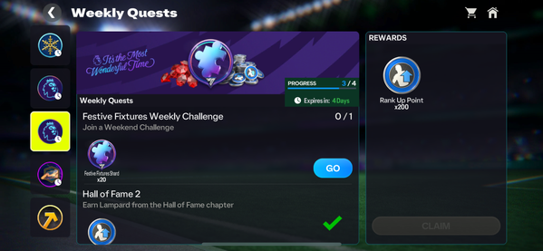 Hello, I attempted to "Join" a Festive Fixtures WEEKEND Challenge. However, "Joining" the Fixture, (and then being eliminated prior to being a Champion/winning it all) provided no credit on the Quest tab....I tried re-entering the Challenge, but wasn't permitted, saying I had 1 of 1 entries. If the requirement was joining AND winning as Champion all the Rounds, then OK, can you please update the Description verbiage, but if NOT, and joining/completing to best of my ability was the requirement, can you please correct my account to reflect it? Thank You. (I'm going to attempt to attach a screenshot, showing the Problem State)