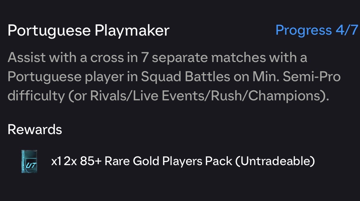 I've completed 7/8 of the Football Fanatics Week 1 tasks, but the last one isn't progressing. I'm working on the Portuguese playmaker task, but it's not progressing. I'm making assists with crosses from the Portuguese player, but when the match ends and I go back to the task section, it hasn't progressed. There are only 2 days left until the task ends. Please find a solution to this.