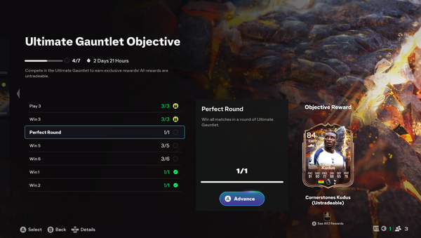 I have recently completed the objective ”Perfect Round” form the objective group ”Ultimate Gauntlet Objective” but not gotten my reward. I won all matches in a round of Ultimate Gauntlet as it says in the description but I haven’t gotten the rewards (Kudud special card and a cosmetic evolution). I have proof of me doing it in the video link below. I would like to get the card if possible! I have done the objective correctly and the game won’t give me the reward.