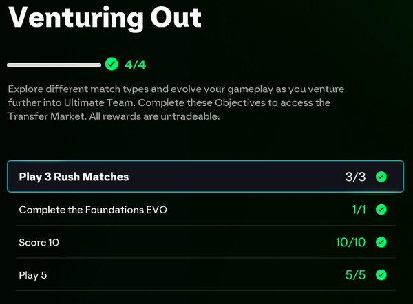 I have fully completed the Foundations EVO as required, but in the Venturing Out objectives it still shows “0/1 Complete the Foundations EVO.” Because of this, I cannot unlock the Transfer Market.