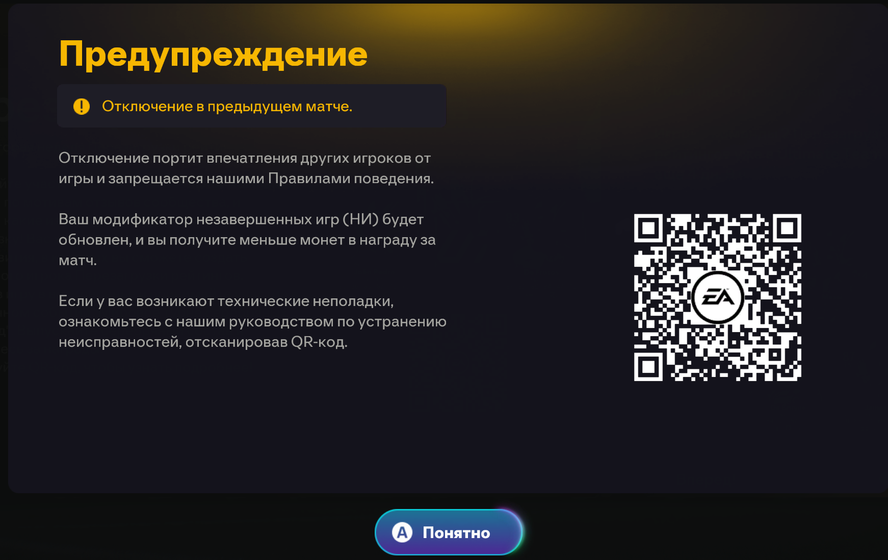 После победы в Champions написало про разрыв соединения и "мы рассчитаем результаты матча позже" или что-то такое. По итогу победа 8-5 превратилась в кик меня с серверов и незаслуженное поражение в Champions, где итак каждый матч на кону. Смысл мне тратить силы и нервы, если каждую Champions я получаю фрустрирующий опыт от плохих серверов игры, где твои усилия помножит на 0 либо сами EA, либо читеры, с которыми они ничего не могут сделать?