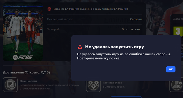 04.12.25 играл онлайн и вдруг по среди матча меня выкинуло и написало, что соединение с сервером пропало. Думаю ладно и выключил ПК. НА следующий день запускаю FC26 - ошибка на стороне сервисав ЕА попробуйте зайти позже. До сих пор не могу запустить игру. С ПК никаких изменений не было. Перепробовал восстановление, антивирус файервол и много чего ещё из интернета - 0 реакции. Сегодня на второй ПК загрузил игру и пытался запустить - такая же проблема.