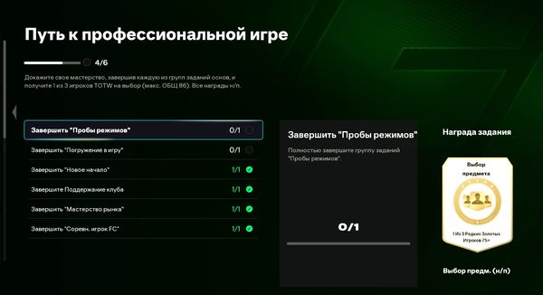 Точно также, "Пробы режимов" и "Погружение в игру" показываются не выполненными