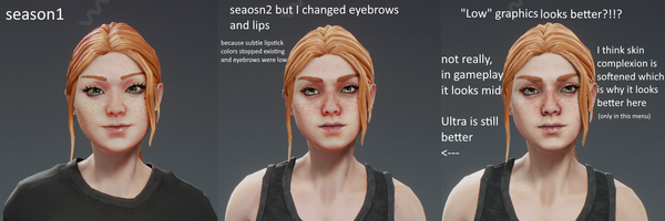the eyes look very intense in ultra settings, but on low they look more normal, and I cant pin why -- I think the dark circles are the same tone -- maybe its the skin complexion being softer in low because the textures are lower res? IDK, but I kind of like how low looks in this situation, and I wish that look was maintained in ultra in all situations but instead whatever is happening in ultra makes the face super "intense" and not as relaxed.