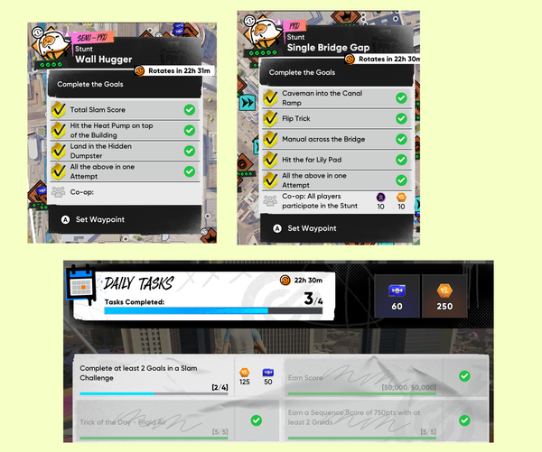 Sadly my recording software is not working so all I have are photos, The one challenge that looks incomplete is bugged and wont check off a goal despite being cleared. I tried to complete it thinking maybe it can clear my daily but nope.