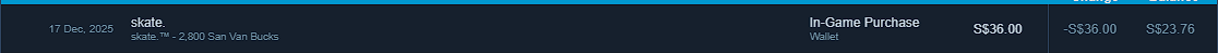 When I spent the S$36 one, the game was buggy (Loading was long, market was refreshing 2 - 3 times, and so was Steam). Then, it simply crashed. I checked steam, and the $$ dropped - but when I opened skate., my SVB remained 150 (that is until I bought the S$7.60 one to compensate myself - now back to 150 after spending a bit for the skate.Pass). Hoping I'd have extra SVBs in case there's cooler emotes to have, but well, seems like the seagulls stole my wallet. Please help! 🙏🙏