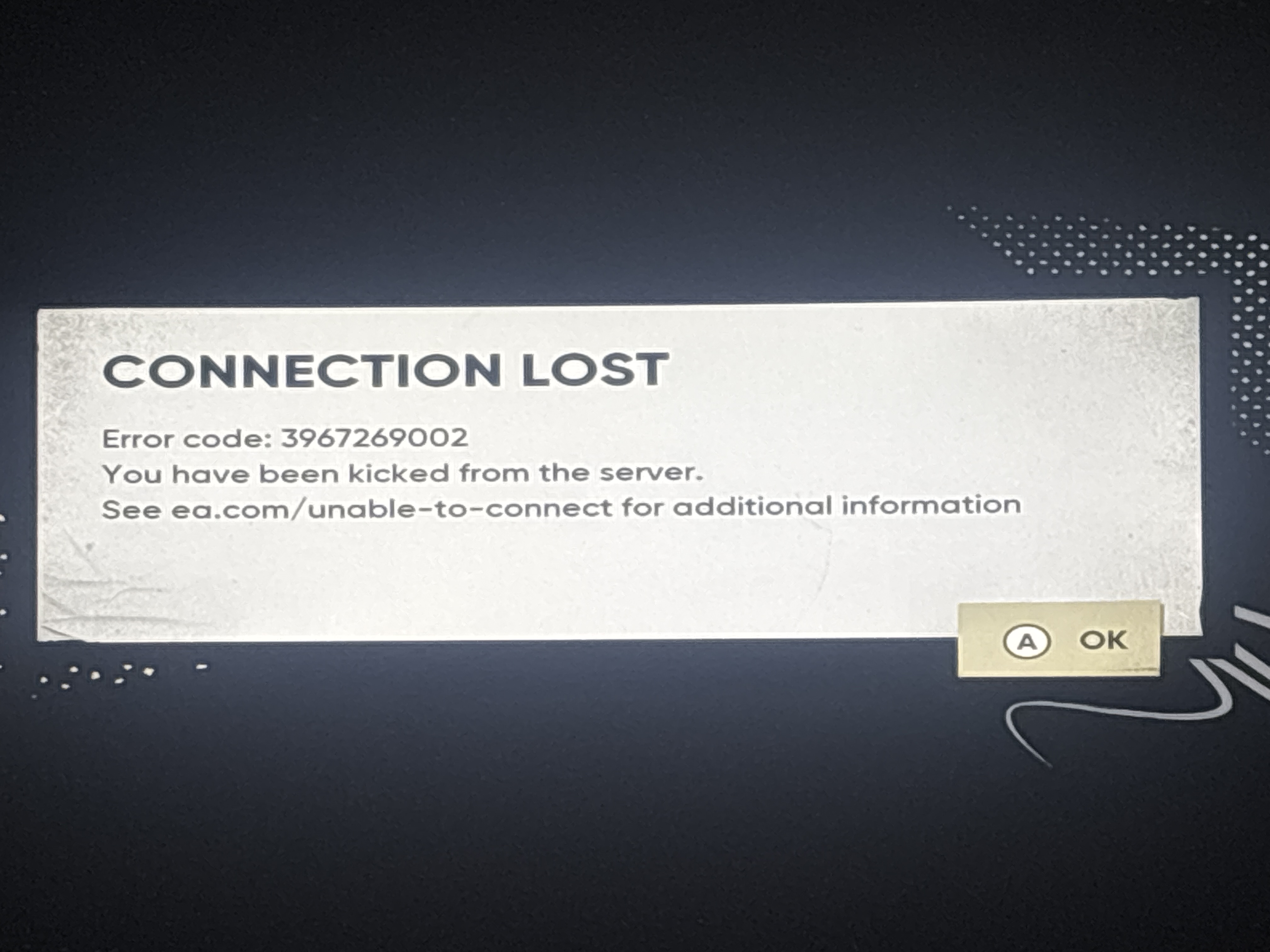 After the update I tried to play game, but there was infinite loading screen. I relaunched the game and got an error message: CONNECTION LOST Error code: 3967269002 You have been kicked from the server. See ea.com/unable-to-connect for additional information. EA server status says that Skate server is ok and online. I tried everyting, repairing the game, reinstalling EGS, watching video from indian guy - nothing works for me. Is the problem on me, or on the EA side? Yesterday everything was alright.