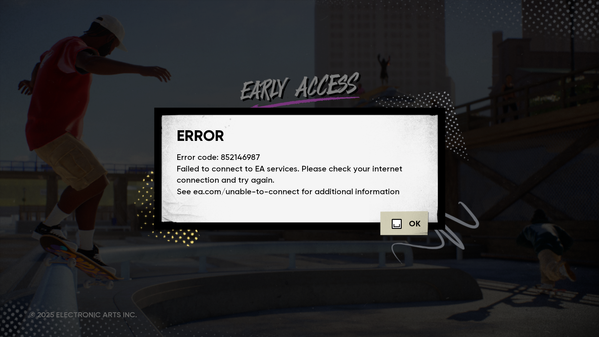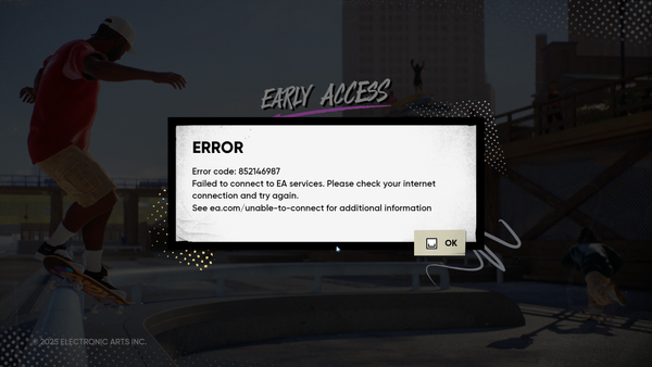 - Error code: 852146987 Failed to connect to EA services. Please check your internet connection and try again.Error Code: 852146987
