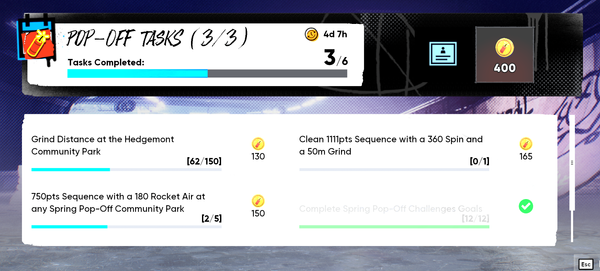 Status changed:InvestigatingtoFixedHi folks! You will now be able to repeat the Spring Pop-Off challenges and progress the "Complete Spring Pop-Off Challenges Goals" task even if you've already completed all the challenges.