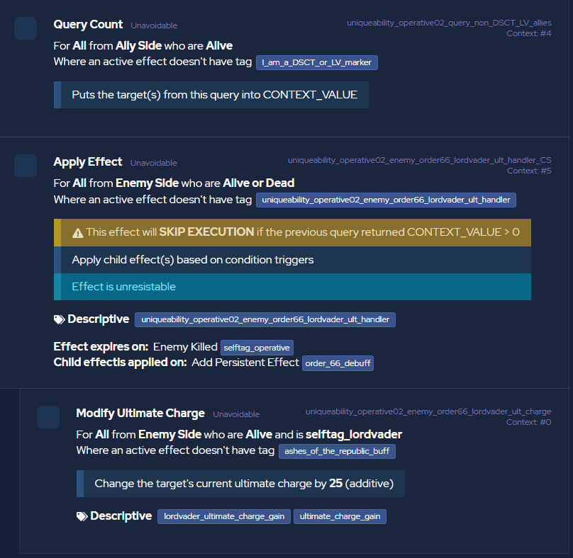 But if you go ahead and check how its coded and works you will see at the end CX-2 gives Lord Vader 25% Ultimate charge upon inflicting Order 66 on enemies.