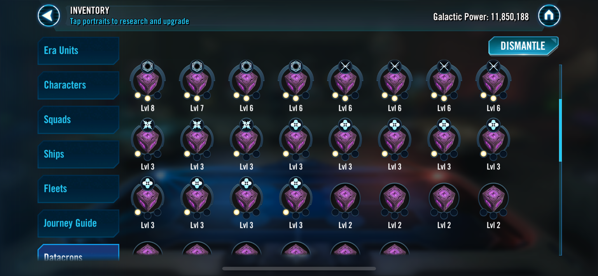 All of my Pillars of War datacrons were fully removed from my inventory except for one random level 3. I had about a dozen of various attacker, tank, support, healer crons that previously got rolled back to level 5. Then with last update they were all completely dusted. Nothing in my inbox with new replacement crons or mats. World class game CG.