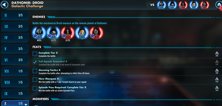 cerebro415Seasoned Rookie7 months agoStatus: ResolvedGallactic challenge giving feats completed falsely Battled only tier VI, got feats marked for scoundrels up until tier X (didnt even use scoundrels), when used scoundrels afterwards on Tier X didnt receive nor the complete battle feat nor Episode...Show More