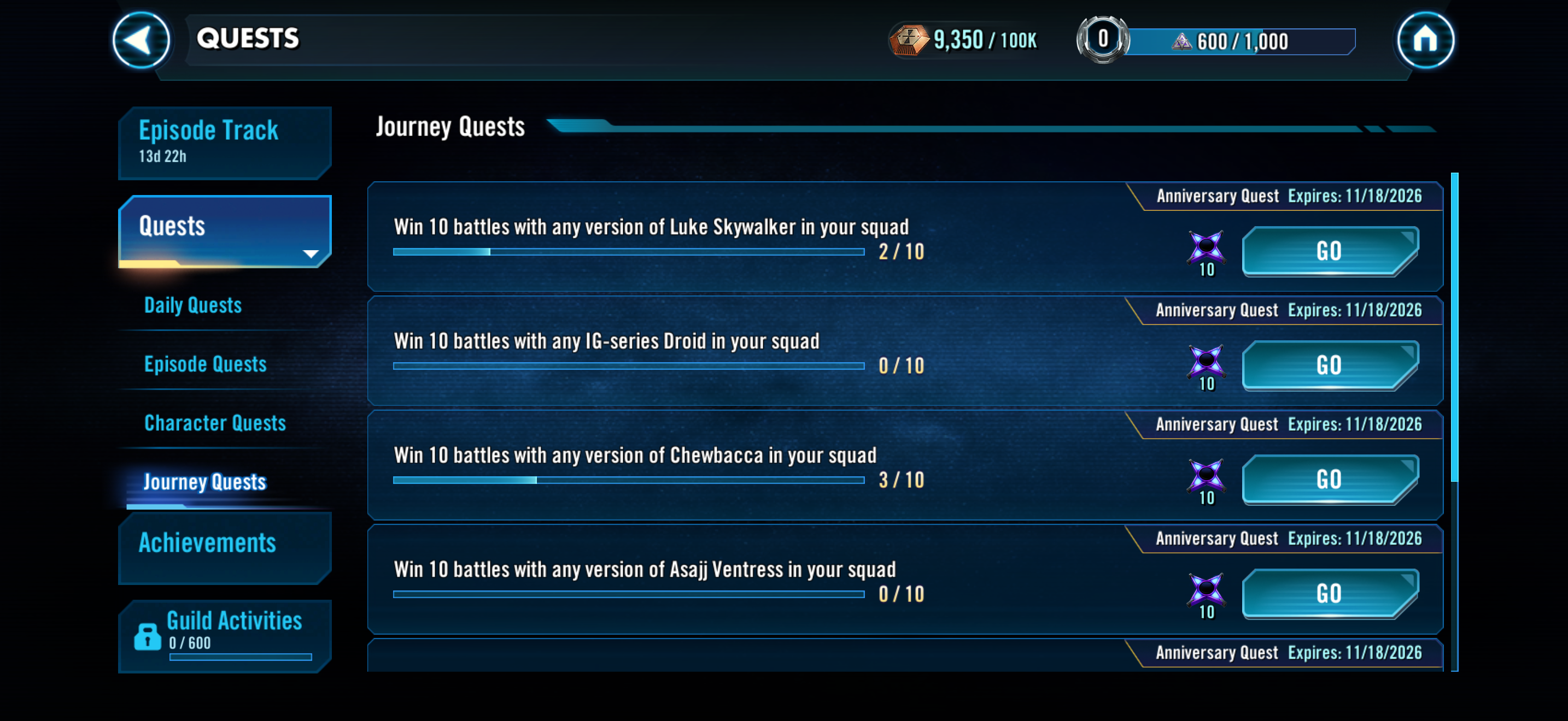 I was working through the Journey Quests for the LST for the Inquisitors and completed the "Defeat 100 enemies with Sith" and when I went to work ok the next quest, "Win 20 battles with a full squad of Empire characters", it did not show up in my Journey Quest tab. I tried reloading the game a few times and closed the app for an hour and reloaded again and still the quest has not shown up. I know the Journey Quest expires in November, but I wanted to work towards the LSTs now so I can do other things later. Ill add some screenshots below.